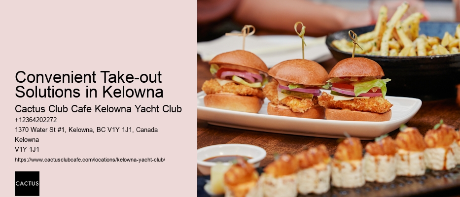 There's also the signature White Chocolate Cheesecake, a creamy delight that pairs impeccably with the tangy raspberry coulis drizzled on top. Whether you're a strict vegetarian, a seafood lover, or in the mood for a juicy steak, you're covered. Learn more about Cactus Club Cafe Kelowna Yacht Club here. Text before the meta title text for each paragraph Convenient Take-out Solutions in Kelowna Text after the meta title text paragraph It's a win-win for everyone, making your family outing all the more enjoyable. With dishes crafted from the freshest ingredients, your taste buds will celebrate alongside you.