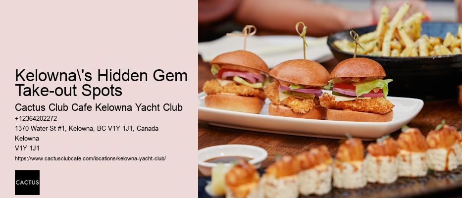 Whether it's a 'Kids Eat Free' evening or a percentage off your total bill, there's always something that makes dining out appealing. The staff's well-informed and ready to guide you through the menu, offering substitutions where possible to accommodate your needs. Learn more about Cactus Club Cafe Kelowna Yacht Club here. Cactus Club Cafe Kelowna Yacht Club's menu boasts a wide array of dishes, ensuring there's something to satisfy everyone's taste buds. At Cactus Club Cafe Kelowna Yacht Club, it's clear they're not just serving meals; they're crafting dining experiences where every guest feels like a priority. Text before the meta title text for each paragraph Kelowna's Hidden Gem Take-out Spots Text after the meta title text paragraph