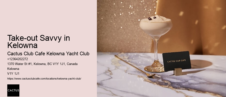 At the heart of the Cactus Club Cafe's appeal is its wide-ranging menu, catering to every palate with an array of carefully crafted dishes. From the moment you're greeted at the door, you'll notice the staff's commitment to ensuring you have a memorable visit. And if you're dreaming of a sunset toast by the water, they've got the perfect spot reserved, just for you. Learn more about Cactus Club Cafe Kelowna Yacht Club here. We've carefully curated a menu that highlights the best of what our local vineyards have to offer, along with exceptional picks from around the globe that meet our strict environmental standards. Text before the meta title text for each paragraph Take-out Savvy in Kelowna Text after the meta title text paragraph