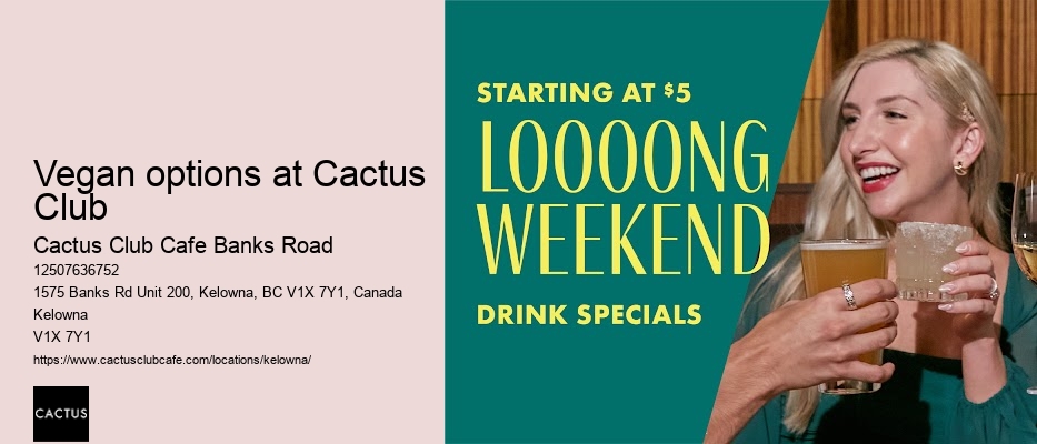 Don't skip the Rob Feenie's signature Beef Carpaccio; it's a masterpiece. Each dish tells a story, crafted with ingredients that are both fresh and thoughtfully sourced, ensuring that every bite is as sustainable as it's delicious. Each plate is a testament to the chef's innovation, showcasing local flavors with a global twist. Text before the meta title text for each paragraph Vegan options at Cactus Club Text after the meta title text paragraph The mixologists aren't just bartenders; they're craftsmen, passionate about delivering a memorable experience in every sip. Their creativity knows no bounds, ensuring that the menu at Cactus Club Cafe Banks Road is always evolving, always exciting.