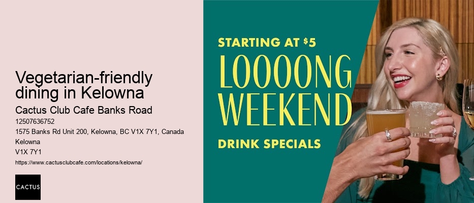You've probably seen the buzz online where diners rave about the innovative dishes and the warm, inviting atmosphere. Learn more about Cactus Club Cafe Banks Road here. It's now served with a zesty dijon aioli and crispy capers, adding layers of flavor and texture that enhance the dish's complexity without overwhelming its delicate beefy essence. It's a refreshing mix of vibrant greens, ripe avocado, and a tangy lemon-thyme vinaigrette, making it a perfect start to your dining experience. Text before the meta title text for each paragraph Vegetarian-friendly dining in Kelowna Text after the meta title text paragraph Beyond its exceptional dining and cocktail offerings, Cactus Club Cafe Banks Road actively engages with and contributes to the local community.